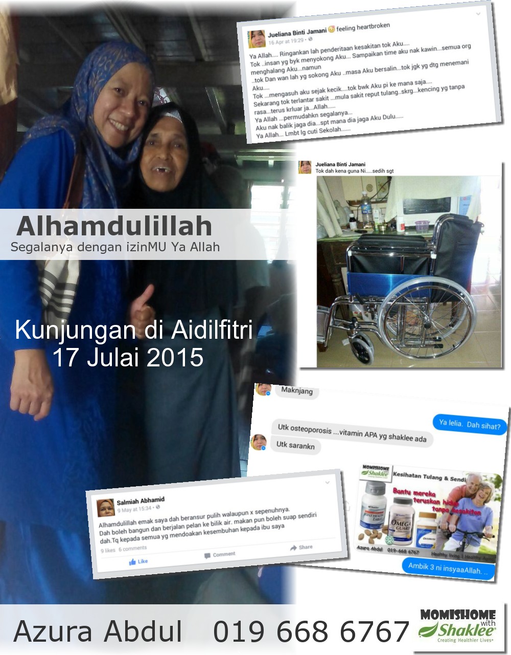 Namun berkat usaha, doa, usaha dan ikatan kasih sayang kekeluargaan antara mereka, Mak Su Som dapat pulih segar selepas 2 minggu menggunakan Supplement Shaklee - Set Kesihatan Tulang Dan Sendi. Dan sambutan Syawal lebih bermakna dengan tahap kesihatan Mak Su Som yang sungguh memberansangkan berbanding sebelum ini.