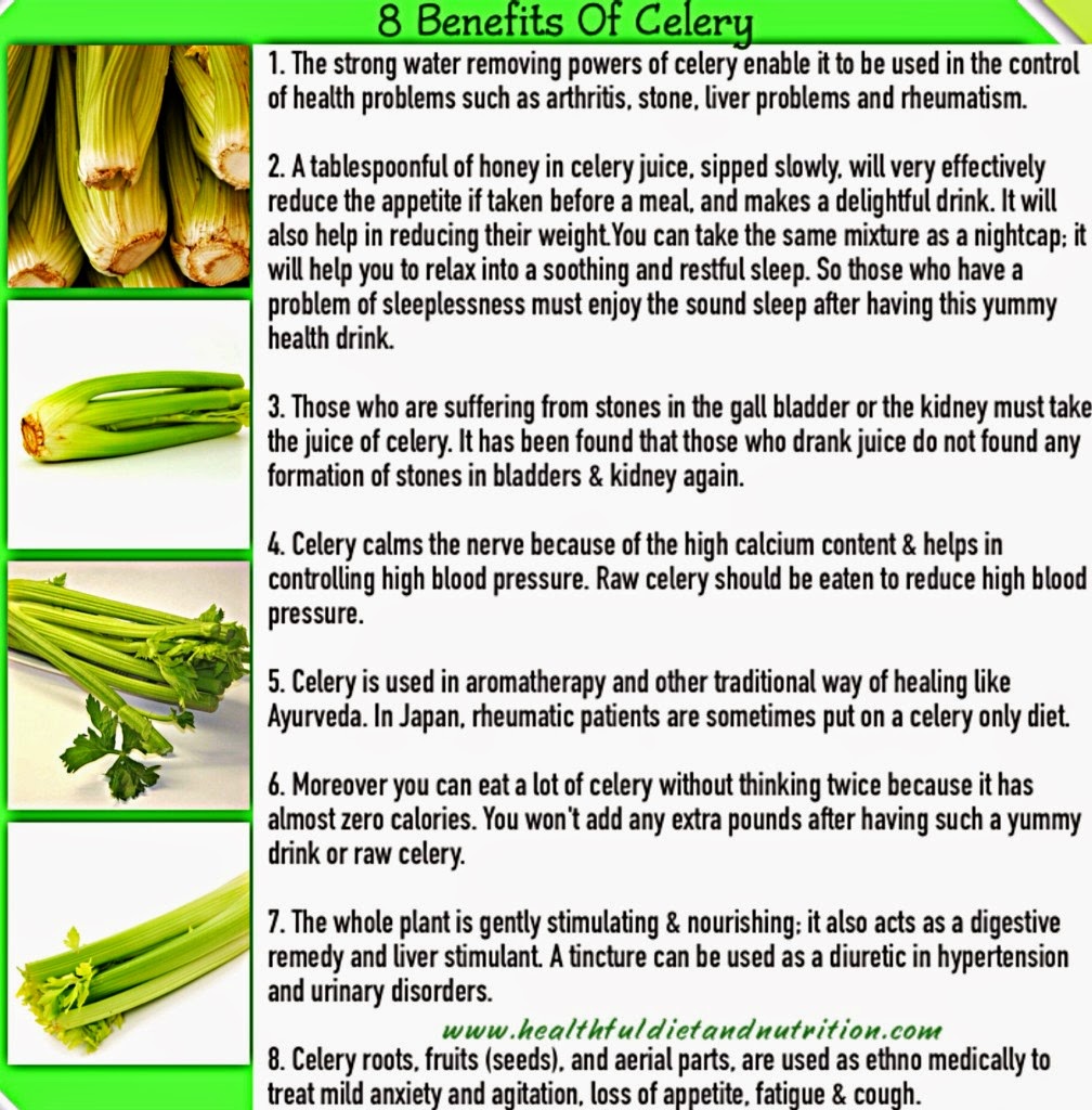 Benefits of Celery Compilation of Benefits of Celery that catch my eyes! Enjoy… November 5, 2014 Posted in Anti-Inflammatory, Blood Pressure, Calming Effect, Celery, Cholesterol, Deuretic, Kidney Stones, Laxative, Neutralize Acidity, Weight Loss