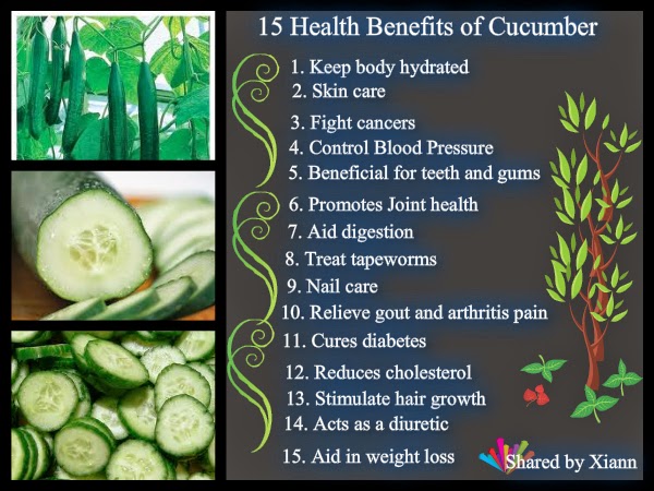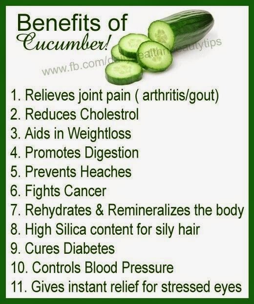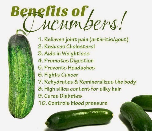 Benefits of Cucumber Compilation of Benefits of Cucumber that catch my eyes! Enjoy… Post Views: 757 November 6, 2014 Posted in Arthritis, Blood Pressure, Cancer, Cholesterol, Cucumber, Deuretic, Digestion, Gout, Hair Problems, Joint Health, Skin care, Teeth and gums, Weight Loss