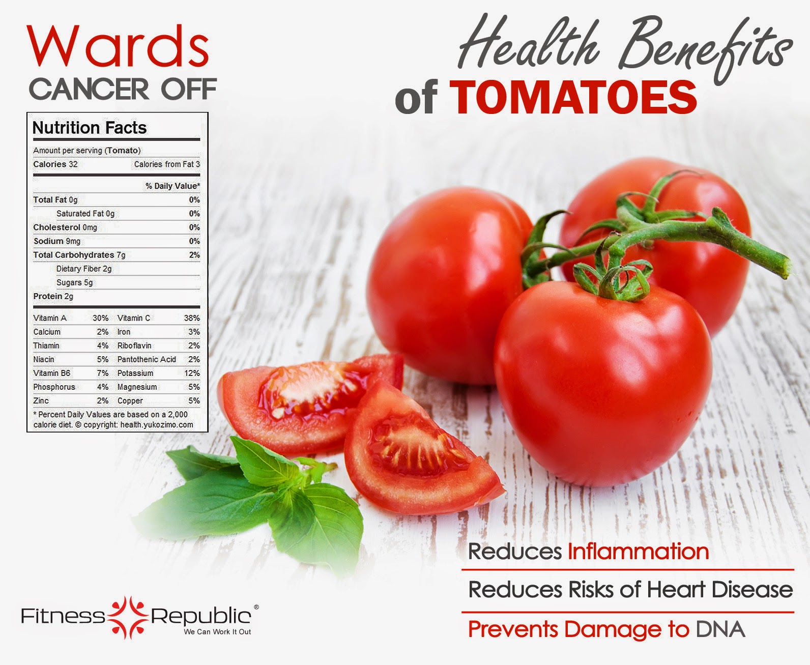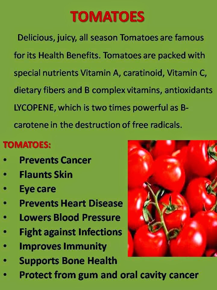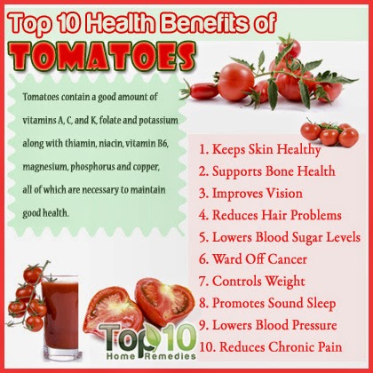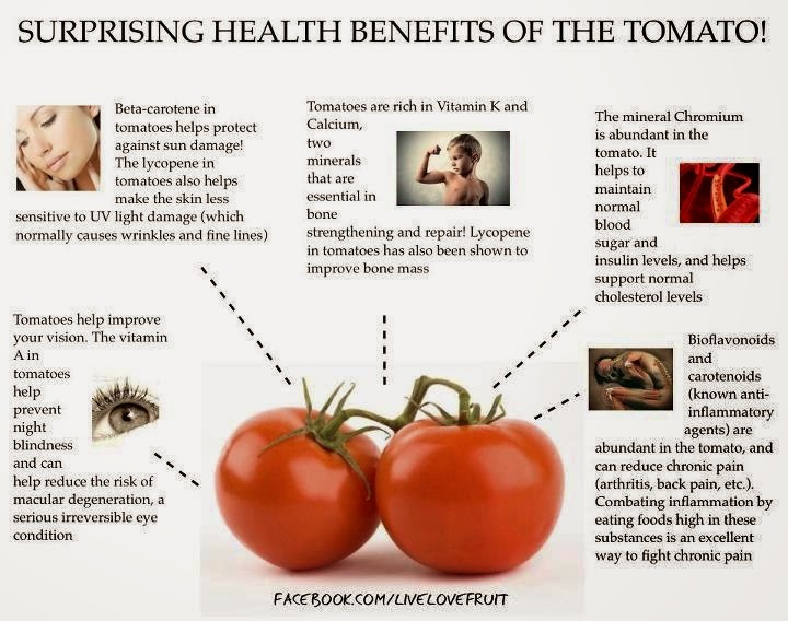 Benefits of Tomato Compilation of Benefits of Tomato that catch my eyes! Enjoy… Post Views: 828 November 5, 2014 Posted in Anti-Inflammatory, Asthma, Blood Pressure, Bone Health, Cancer, DNA protection, Good Sleep, Hair Problems, Heart Disease, Lower Blood Sugar Levels, Tomato, Vision, Weight Loss