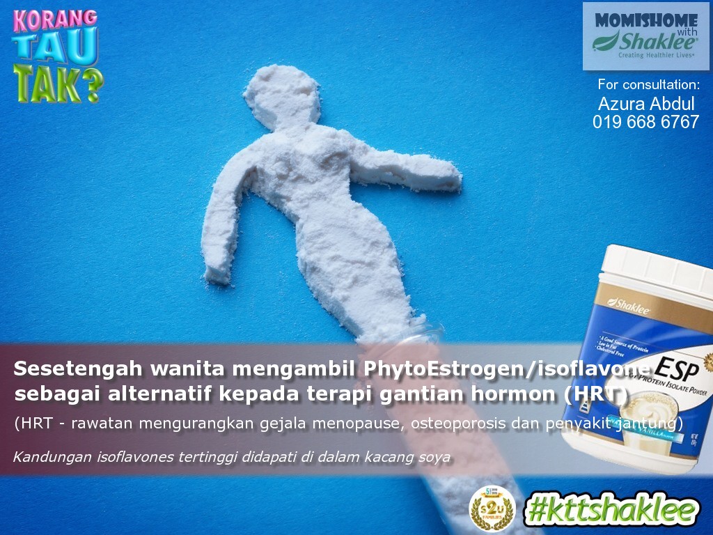 Ramai juga wanita yang beralih kepada PhytoEstrogen (isoflavones) sebagai alternatif untuk HRT. InSyaaAllah PhytoEstrogen (plant-based estrogen) tidak mempunyai risiko seperti di atas.