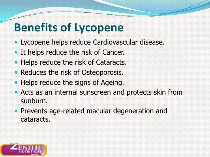 Lycopene is an antioxidant which appears to prevent the formation of harmful by-products of metabolism called free radicals. Free radicals are thought to be responsible for damaging the body’s cells, as well as their genetic makeup, leading to certain chronic diseases.